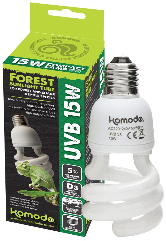 Úsporná terarijní žárovka Komodo Compact Lamp UVB 5% je ideální pro menší terária (o délce max. 60 cm) a pro chov plazů, kteří vyžadují menší množství UVB záření (např. pralesních druhů).