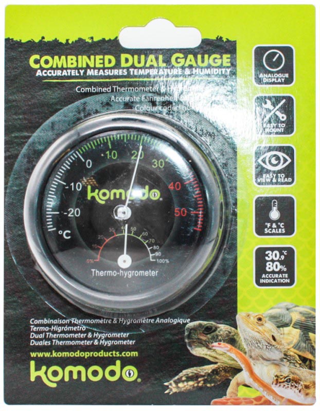 Sledování teploty a vlhkosti v teráriu je nezbytné pro úspěšný chov jakéhokoli terarijního zvířete. Kombinovaný teploměr a vlhkoměr Komodo s analogovým displejem má vše, co k tomu potřebujete.
