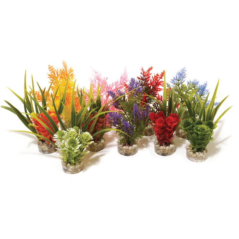Plastová rostlina je upevněna v těžkém základu z kamínků spojených pryskyřicí.