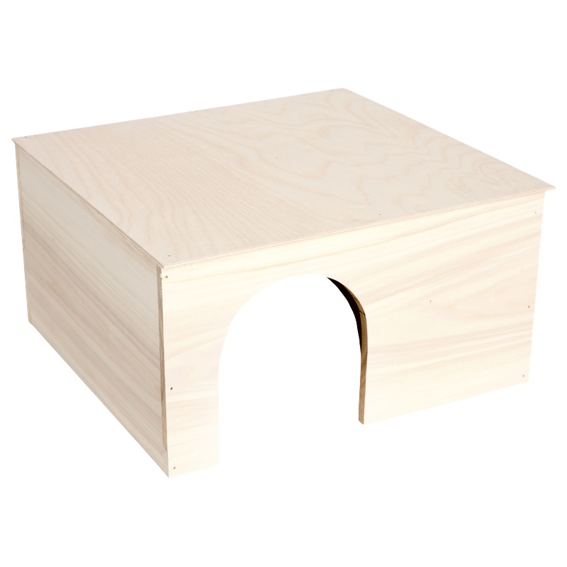 Prostorný domek z kvalitní překližky, bezpečné pro drobné savce (překližka s certifikátem pro výrobu dětského nábytku). Dostatečně prostorný vchod a prostor uvnitř domku. Rovná střecha domku slouží jako patro, poskytuje prostor navíc.