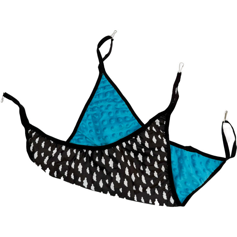 Samohýl Exclusive závěsný pelech (loďka) je pohodlná a odolná hamaka určená k odpočinku i zábavě drobných hlodavců. V rozích má poutka opatřená karabinkami pro snadné připevnění ke kleci. Pružný lem zajišťuje uzavřenější tvar hamaky při zavěšení, takže zvířata mají větší pocit bezpečí. Pelech je ušitý ze dvou vrstev látky: na vnitřní stranu byla použita měkká a hřejivá minky tyrkysové barvy, vnější strana je bavlněná s motivem černobílých mráčků.