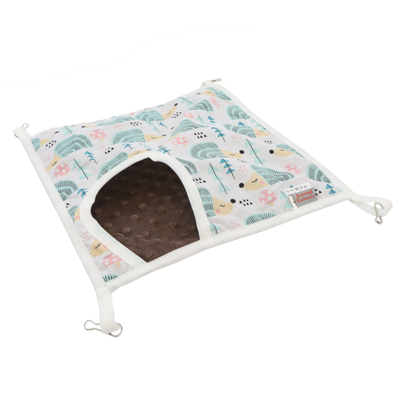 Pohodlný závěsný pelíšek střední velikosti pro chvíle bezpečného odpočinku a zábavy drobných savců. Hamaka je ušitá ze dvou vrstev látky: na vnitřní stranu byla použita měkká a hřejivá minky hnědé barvy, vnější strana je bavlněná s motivem ježků. V rozích jsou všitá poutka opatřená karabinkami pro snadné zavěšení v kleci.