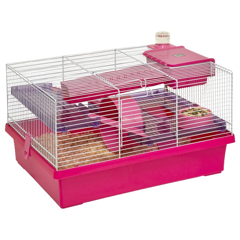 Komfortní plně zařízená klec pro syrské křečky a křečíky.