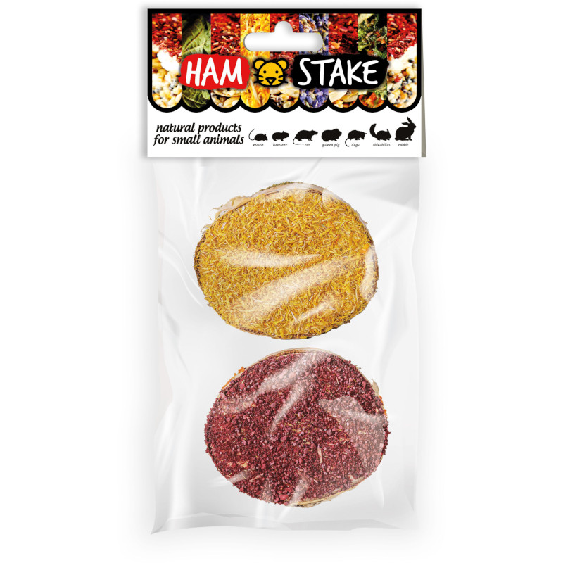 Dvě březová kolečka obalená v mrkvi, měsíčku, červené řepě a petrželi lákají drobné savce k přirozenému obrušování zubů. Zábavný pamlsek je určený zejména pro králíky, morčata, činčily, osmáky, ale také křečky, potkany, myši a další hlodavce.