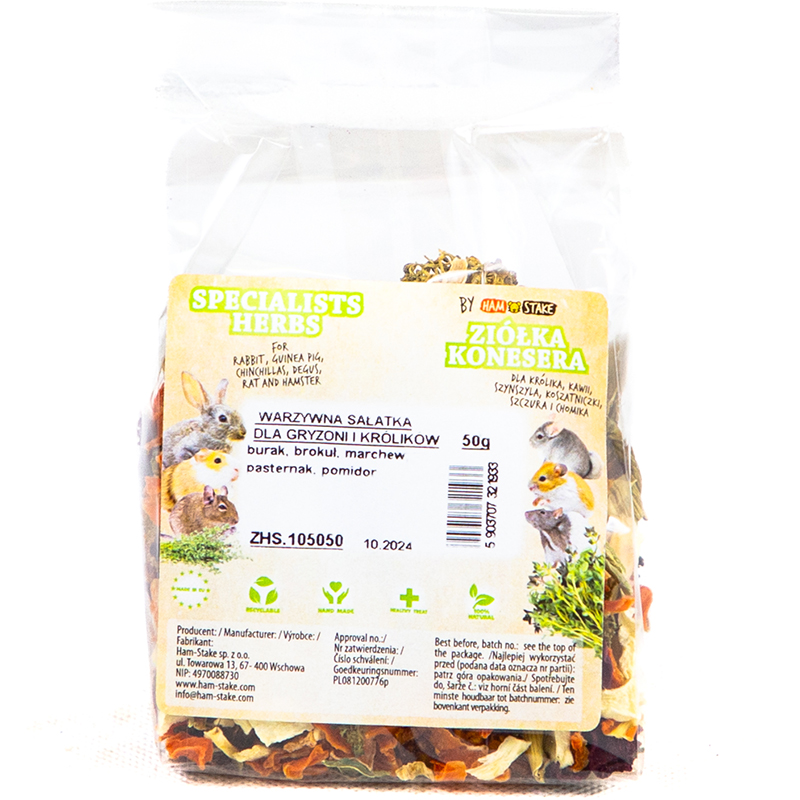 Čistě přírodní směs sušené zeleniny je určená ke zpestření jídelníčku vašeho drobného hlodavého kamaráda. Chutnou zeleninu můžete zvířeti opatrně nabízet z ruky jako odměnu a tím upevňovat váš vztah. Nebo můžete 1–2 kousky schovat v kleci či v ohrádce a podnítit tak u zvířete přirozený pud hledání potravy.