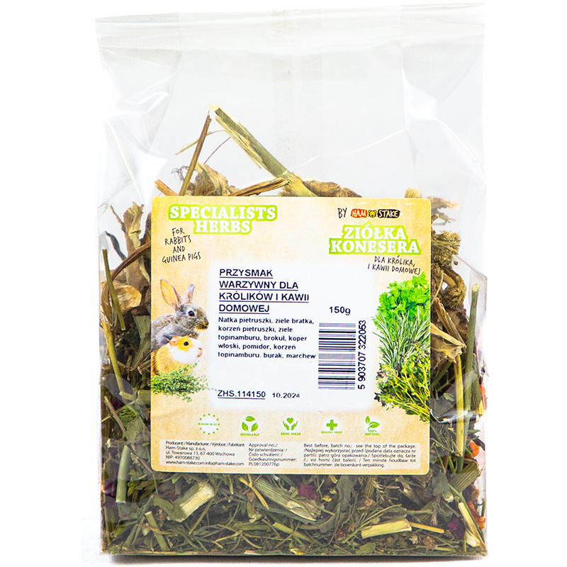 Čistě přírodní směs zeleniny a bylin je určená ke zpestření jídelníčku vašeho drobného hlodavého kamaráda. Chutnou sušenou zeleninu doplněnou bylinami můžete zvířeti opatrně nabízet z ruky jako odměnu a tím upevňovat váš vztah. Nebo můžete 1–2 kousky schovat v kleci či v ohrádce a podnítit tak u zvířete přirozený pud hledání potravy.