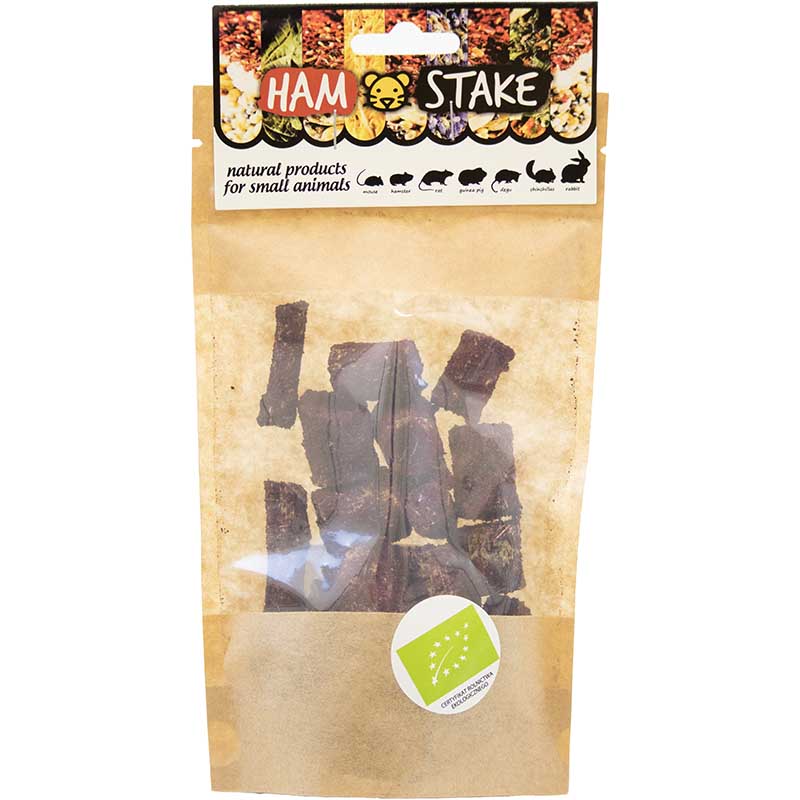 Grain free pamlsky Ham-Stake s kousky topinamburových stonků obalených v sušené červené řepě jsou ideální chutnou, křupavou a zdravou svačinkou pro králíky, morčata, osmáky, činčily, křečky, potkany, myši a pískomily. Topinamburové stonky a červená řepa jsou vhodným zdrojem dietní vlákniny a obsahují množství přirozeně se vyskytujících vitamínů, minerálů a dalších zdraví prospěšných látek. Upravují zažívání, čistí organizmus, zlepšují krevní oběh, posilují imunitu a zvyšují vitalitu.