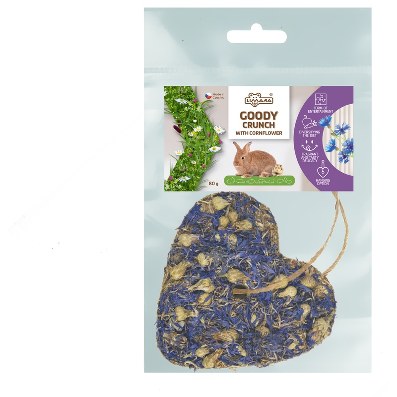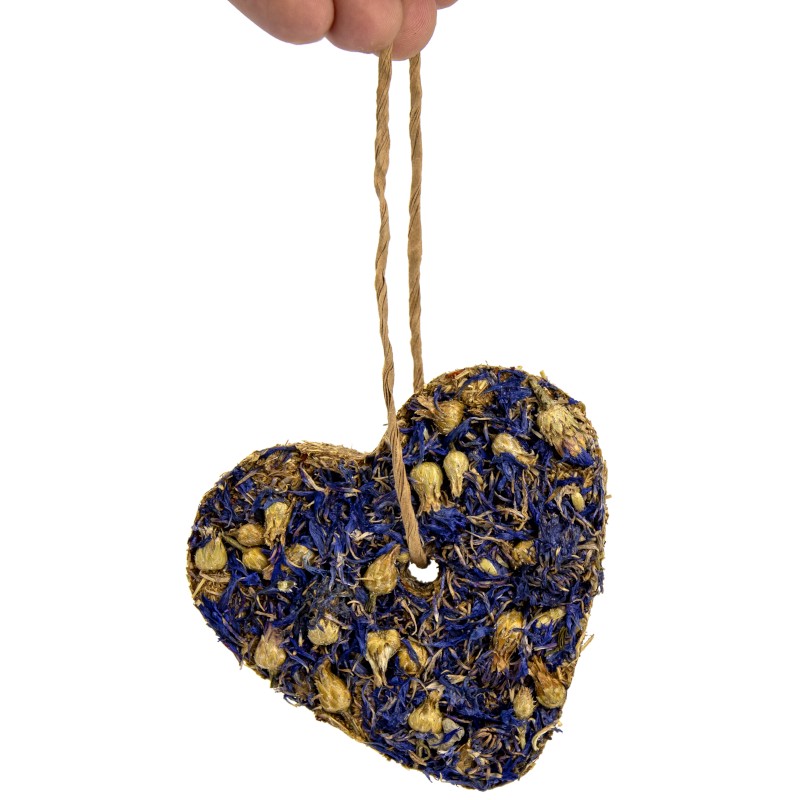 Bezobilné bylinkové srdce s chrpou poskytne králíkům a hlodavcům zdravou odměnu, zábavu a příjemné zpestření jídelníčku. Sušené květy chrpy podporují trávení, přirozené čištění organismu a zdraví močových cest. Pamlsek lze díky přírodnímu provázku zavěsit do ubikace.