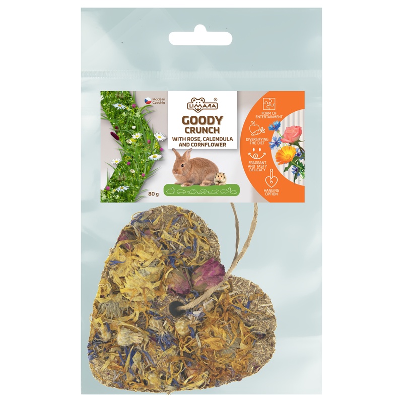 Bezobilné bylinkové srdce s měsíčkem, chrpou a růží poskytne králíkům a hlodavcům zdravou odměnu, zábavu a příjemné zpestření jídelníčku. Pamlsek lze díky přírodnímu provázku zavěsit do ubikace.