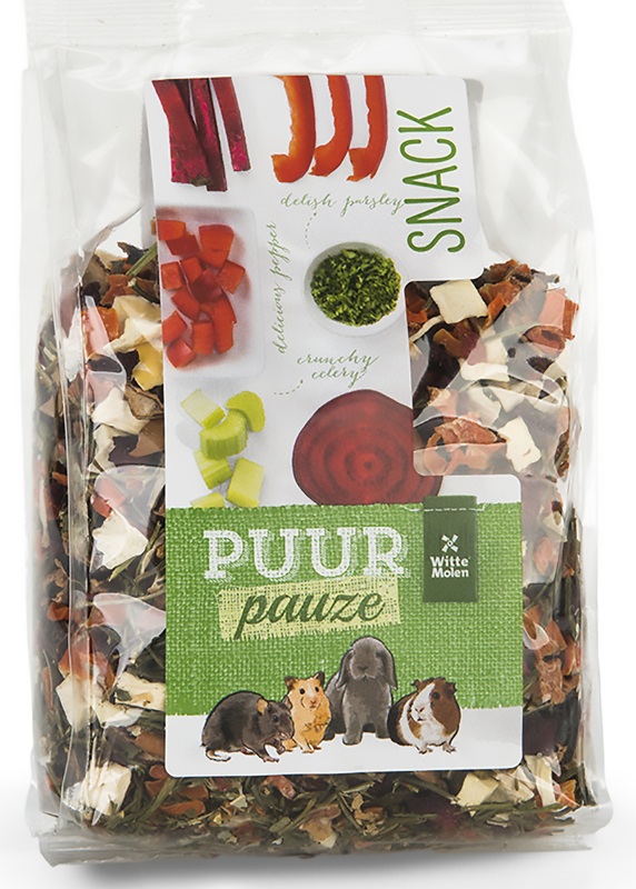 PUUR pauze snack je lahodná směs výhradně z přírodních surovin pro drobné savce. Neodolatelná rafinovaná kombinace chutí a vůní zeleniny a bylinek.