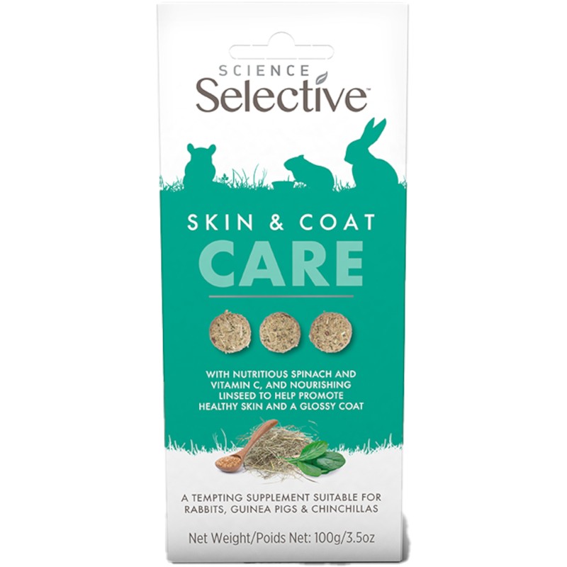 Chutné pamlsky Science Selective Skin & Coat Care mají vysoký obsah vlákniny a obsahují lněné semínko bohaté na omega-3 a omega-6 mastné kyseliny, špenát a vitamín C. Pomáhají podporovat zdraví kůže a srsti u králíků, morčat a činčil s citlivou pokožkou (snadno podrážděnou, se klony ke svědění, suchou nebo šupinatou) a problematickou srstí (řídnoucí, matnou nebo zplihlou). Pamlsky jsou ideální pro krmení z ruky – k navázání či prohloubení vztahu s drobným mazlíčkem. Složení je čistě přírodní, bez umělých barviv, příchutí a přidaných cukrů.