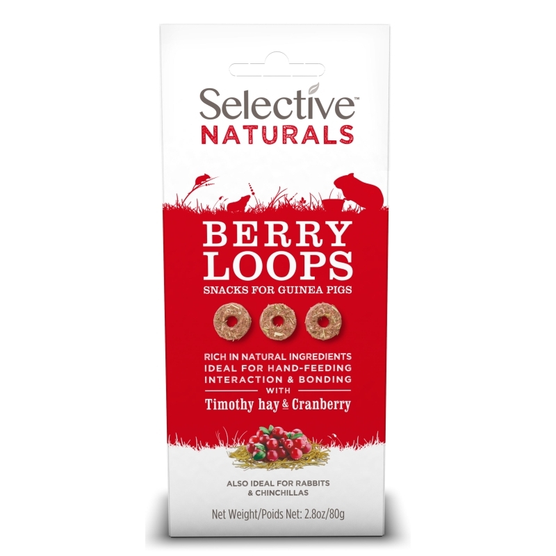 Zdravé přírodní pamlsky Selective Naturals ve tvaru kroužků pro morčata, králíky, činčily a další býložravé drobné savce. Ideální pro podávání z ruky, které sbližuje a pomáhá vytváření bližšího vztahu se zvířetem.