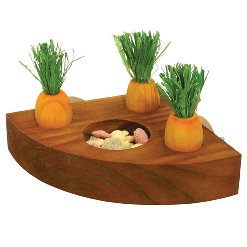 Masivní dřevěný rohový držák s dřevěnými mrkvičkami - interaktivní hračka pro králíky, morčata, křečky a ostatní hlodavce.