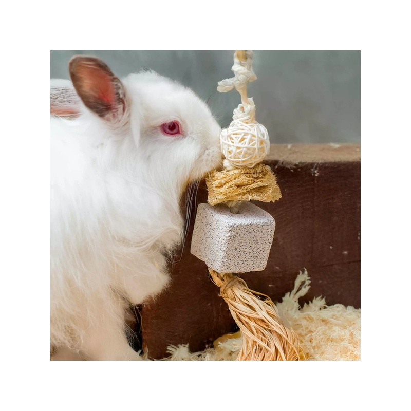 Hračka pro králíky a hlodavce je vyrobená z různých přírodních materiálů. Nabízí několik hlodacích prvků, které přinášejí pestrost a stimulaci. Vaše zvíře si s ní bude rádo hrát a okusovat ji. Podporuje přirozené hlodací chování a pomáhá naplnit potřebu obrušování zubů. Snadno ji zavěsíte do každé klece nebo jiné ubikace.