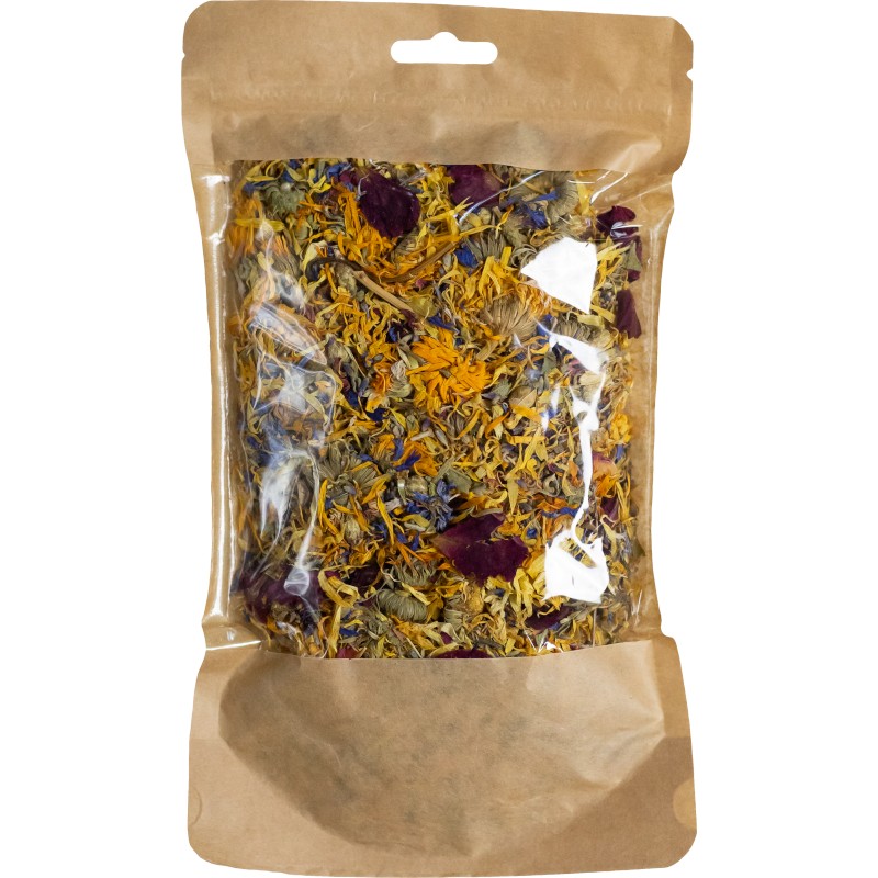 měsíček lékařský 25 %, růže okvětní lístky 25 %, levandule květ 25 %, chrpa květ 25 %.