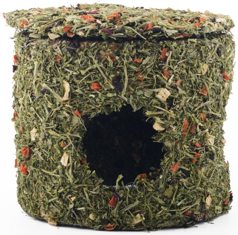 Domek z celulózy obalený ze všech stran bylinkami a sušenou zeleninou. Příjemné ubytování zejména pro křečky, potkany, myši, osmáky a další drobné savce na dobu, než neodolatelný domek sežerou.