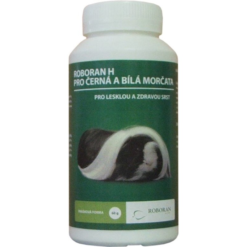 Roboran H pro černá a bílá morčata je doplněk specificky účinných látek, určený pro morčata s černým a bílým zbarvením, u kterých je nežádoucí žlutý nebo hnědý nádech srsti. Má výrazný vliv na zlepšení barvy, kvality srsti a zdravotního stavu kůže.