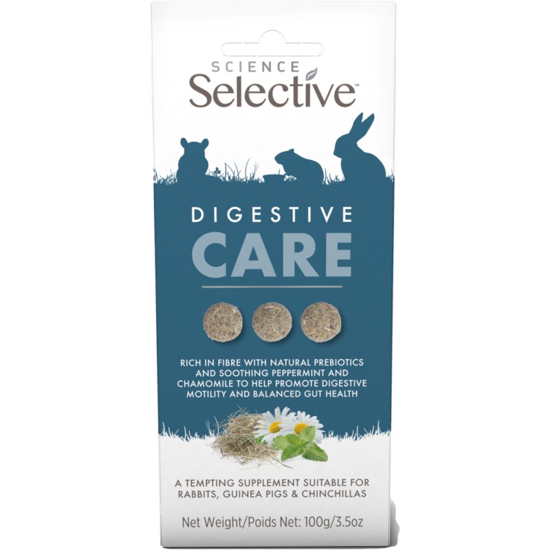 Chutné pamlsky Science Selective Digestive Care jsou bohaté na vlákninu, obsahují přírodní prebiotika a zklidňující mátu peprnou a heřmánek. Podporují zdraví střev a celkovou rovnováhu trávicí soustavy králíků, morčat a činčil se sklony k plynatosti, nadýmání a tvorbě chomáčů chlupů (trichobezoárů) v žaludku. Pamlsky jsou ideální pro krmení z ruky – k navázání či prohloubení vztahu s drobným mazlíčkem. Složení je čistě přírodní, bez umělých barviv, příchutí a přidaných cukrů.