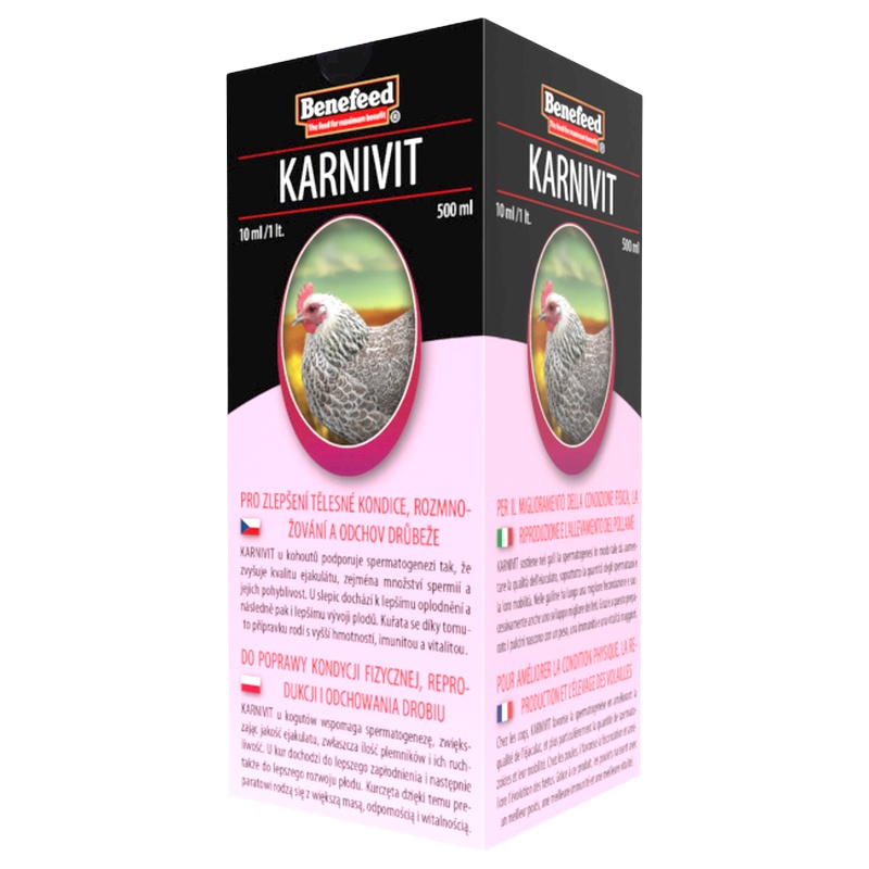 KARNIVIT obsahuje specifický komplex látek zlepšujících reprodukci drůbeže ve Vašem chovu. Všechny aktivní látky jsou ve formě, která zajistí maximální účinnost každé z nich.