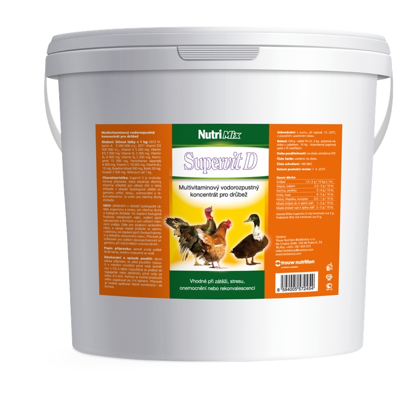 Supervit D je vhodný v období fyziologické zátěže organismu nebo stresu, pro všechny druhy a kategorie drůbeže. Pro zvýšení líhnivosti a oplozenosti vajec, pro udržení intenzivní snášky, na podporu správného růstu a vývoje mláďat a ke zlepšení jejich životaschopnosti a obranyschopnosti.
