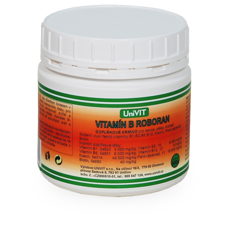 ROBORAN B je vodorozpustný komplex vitamínů skupiny B, které jsou důležitým činitelem v období stresu, v období intenzivního růstu, pro zlepšení reprodukčních schopností zvířat a zlepšení životaschopnosti mláďat. Komplex B - vitamínů působí příznivě při poruchách srsti a opeření. Roboran B doporučujeme podávat při mimořádném zatížení organismu, při poruchách reprodukce, změnách prostředí a v období rekonvalescence, dále ke zlepšení cekového stavu telat, prasat a drůbeže, k příznivému ovlivnění snášky u drůbeže.