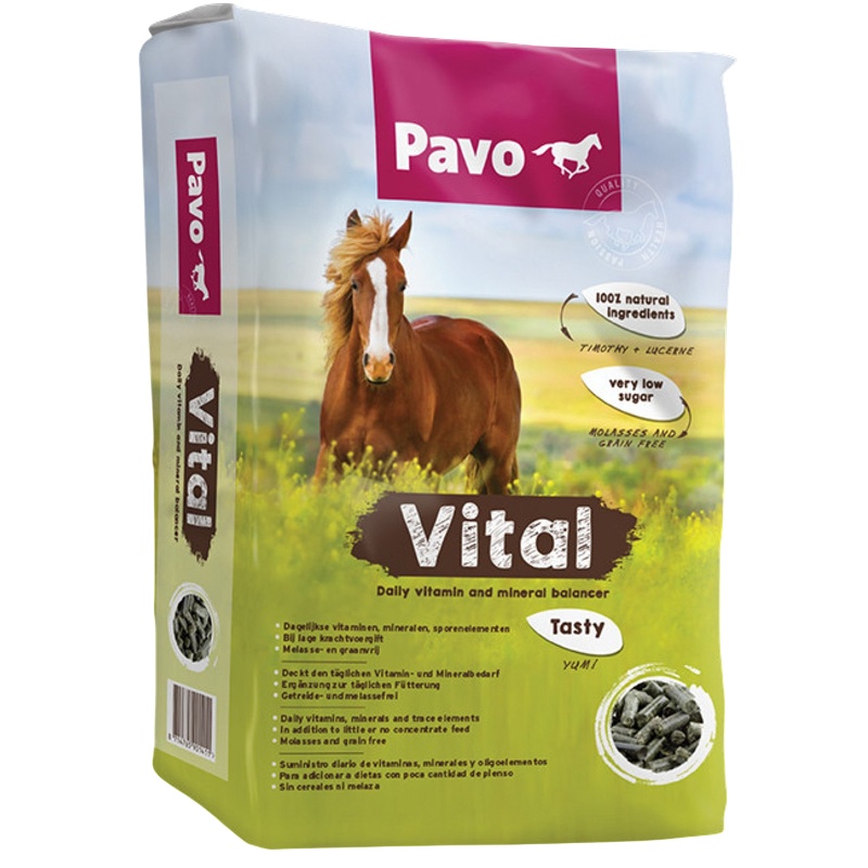 Pavo Vital je doplněk pro denní použití. Granule s obsahem všech vitaminů a minerálních látek, které váš kůň potřebuje, vyrobený ze 100% přírodních surovin a neobsahuje zbytečné doplňkové látky. Pavo Vital je unikátní díky obsahu nové formy stopových prvků - Intellibond®. Normálně mají stopové prvky jako je měď a zinek pro koně špatnou chuť, a tak doplňky s obsahem těchto prvků nejsou často chutné. Ale speciální Intellibond® stopové prvky jsou rozloženy v žaludku (ne v hubě) koně. Proto nemají negativní efekt na chutnost. Společně s přídavkem bojínku lučního a vojtěšky jsou Pavo Vital velmi chutné granule.
