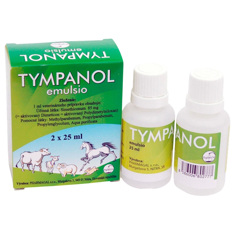 Tympanol je přípravek s obsahem polydimetylsiloxanu, aktivovaného koloidním oxidem křemičitým ve formě emulze jako účinný prostředek při plynatosti a jako odpěnovací prostředek, založený na rozrušování pěny ovlivňováním povrchového napětí. Způsobuje splývání plynových bublinek a ulehčuje tak odchod plynů.