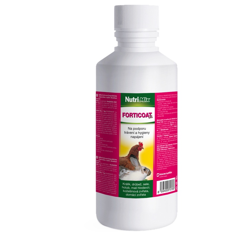 Nutrimix Forticoat je blend synergicky působících organických kyselin a jejich solí. Organické kyseliny velmi efektivně snižují pH pitné vody a obsahu žaludku a tím podporují trávení živin. Pufrované kyseliny (jejich soli) pomáhají při udržení pozitivní mikrobiální balance ve střevě.