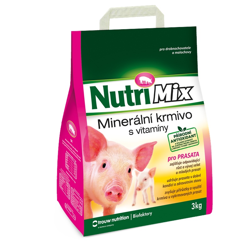 NutriMix pro prasata je určen na doplnění minerálních látek a vitaminů pro odstavená selata a vykrmovaná prasata v drobnochovech. Podporuje dosažení vysokých přírůstků, využití přijatých živin a zajišťuje odpovídající zdravotní stav. Přidává se do krmné dávky, která je založena na obilných šrotech, kuchyňských zbytcích nebo jiných neplnohodnotných krmivech.