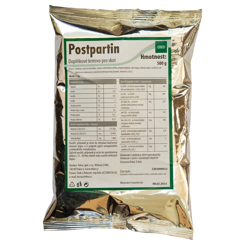 Minerální doplňkové krmivo pro otelené krávy a vysokobřezí jalovice a pro zvířata se zdravotními poruchami ve všech obdobích reprodukčního cyklu, pro dojnice s ketózou nebo jaterní steatózou. Přípravek se předkládá právě otelenému zvířeti ke spontánnímu vypití. Otelená dojnice by měla Postpartin přijmout před prvním napitím z napáječky.