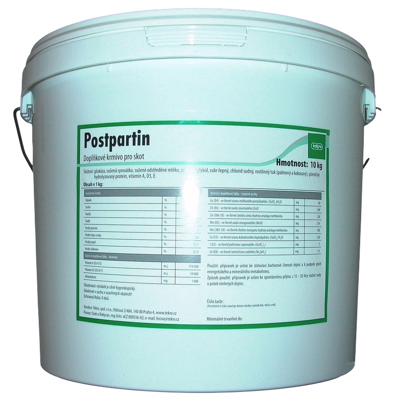 Minerální doplňkové krmivo pro otelené krávy a vysokobřezí jalovice a pro zvířata se zdravotními poruchami ve všech obdobích reprodukčního cyklu, pro dojnice s ketózou nebo jaterní steatózou. Přípravek se předkládá právě otelenému zvířeti ke spontánnímu vypití. Otelená dojnice by měla Postpartin přijmout před prvním napitím z napáječky.