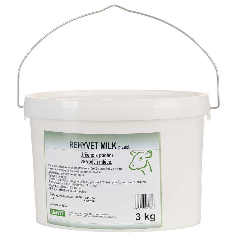 REHYVET MILK řeší problémy dehydratace a acidóz vzniklých při průjmových onemocněních u telat. Díky použitému citronanu lze kombinovat použití přípravku s napájením mlékem. Tím se do těla telete dopraví dostatek energie a bílkovin, které je částečně schopno vstřebat a trávit i poškozené střevo. Po aplikaci připraveného roztoku dochází k rychlému vyrovnání ztráty vody, sodíkových a draselných iontů a energie.