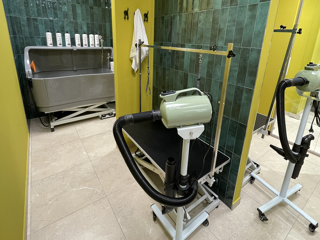 Usušit mazlíčky můžete jak čistými, voňavými ručníky, tak výkonným fénem Ibáñez VOLCANO (max. 2 800 W) na pojízdném stojanu a s dlouhou hadicí, která pohodlně dosáhne na pracovní stůl i do vany. (Stůl má stejně jako vana nastavitelnou výšku, abyste se k mazlíkovi nemuseli shýbat.)