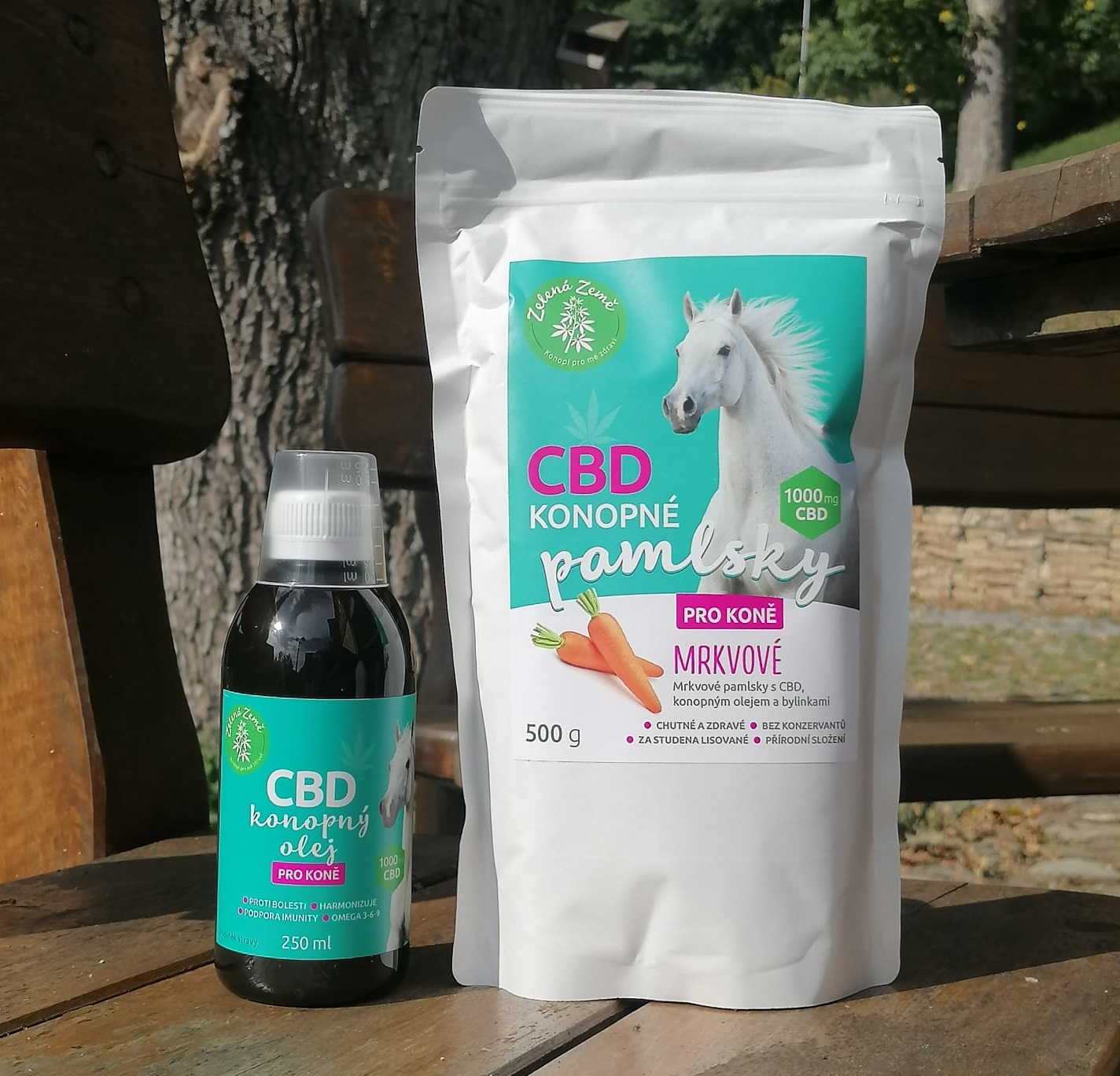 Stejné prospěšné účinky – od podpory zdraví kůže a srsti přes tlumení bolesti a zánětů po mírnění stresu a neklidu – mají konopné produkty i u koní. Pokud jde o ty s CBD, je Zelená Země v našich končinách průkopníkem: CBD přípravky pro koně registrovala jako první v České republice! Jejich oleje, mrkvové pamlsky a komplexní kloubní výživu s CBD využívají jako přírodní alternativu k syntetickým léčivům zejména majitelé koní trpících artrózou, nervozitou či nespavostí, dušností či kašlem apod. Pomáhá také koním s PSSM (myopatií ze zvýšeného ukládání polysacharidů) – genetickým onemocněním, které způsobuje křeče, ztuhlost a někdy až poškození svalů a jehož léčba vyžaduje přísnou dietu. CBD pak může přispět k uvolnění svalstva, zlepšení psychického stavu i mírnění případných zánětů.