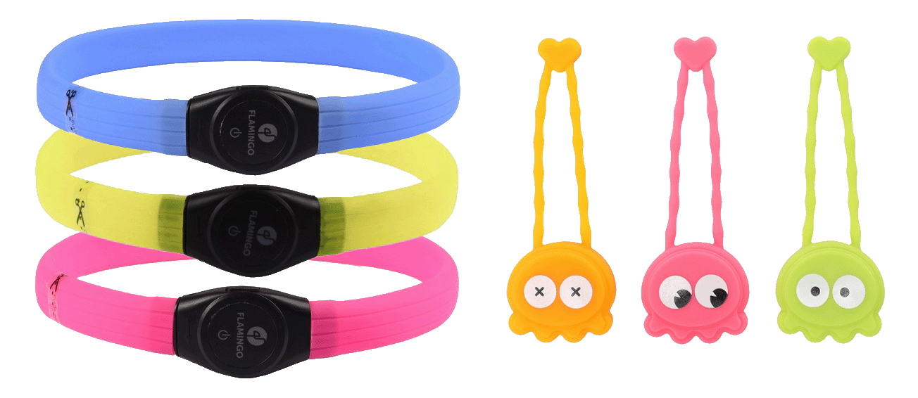 Silikonové LED doplňky od Flamingo navíc splňují normu ochrany IP44, takže do nich nevnikne stříkající voda ani velmi malé předměty (> 1 mm). Obojky Ilona Visio zajišťují viditelnost až na 500 m, dobíjejí se pomocí přiloženého micro USB kabelu a dají se jednoduše zastřihnout na požadovaný obvod (viz video). Přívěsky Fozy jsou viditelné až na 300 m a mají vyměnitelnou baterii. U obou můžete využít tři módy svícení – nepřetržité světlo, pomalé blikání a rychlé blikání.