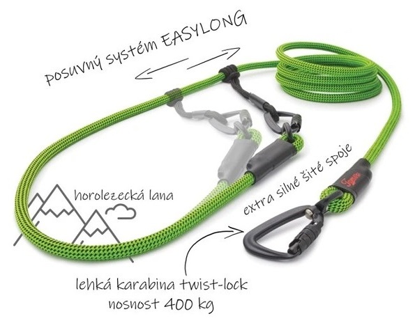 Modely Easylong mají navíc unikátní posuvný systém (viz obrázek), kterým lze vodítko jednoduše zkrátit či prodloužit na požadovanou délku. A varianty Twist jsou místo klasické hákové karabiny opatřené odlehčenou horolezeckou D-karabinou s bezpečnostním zámkem Twist-Lock ovladatelným jednou rukou.