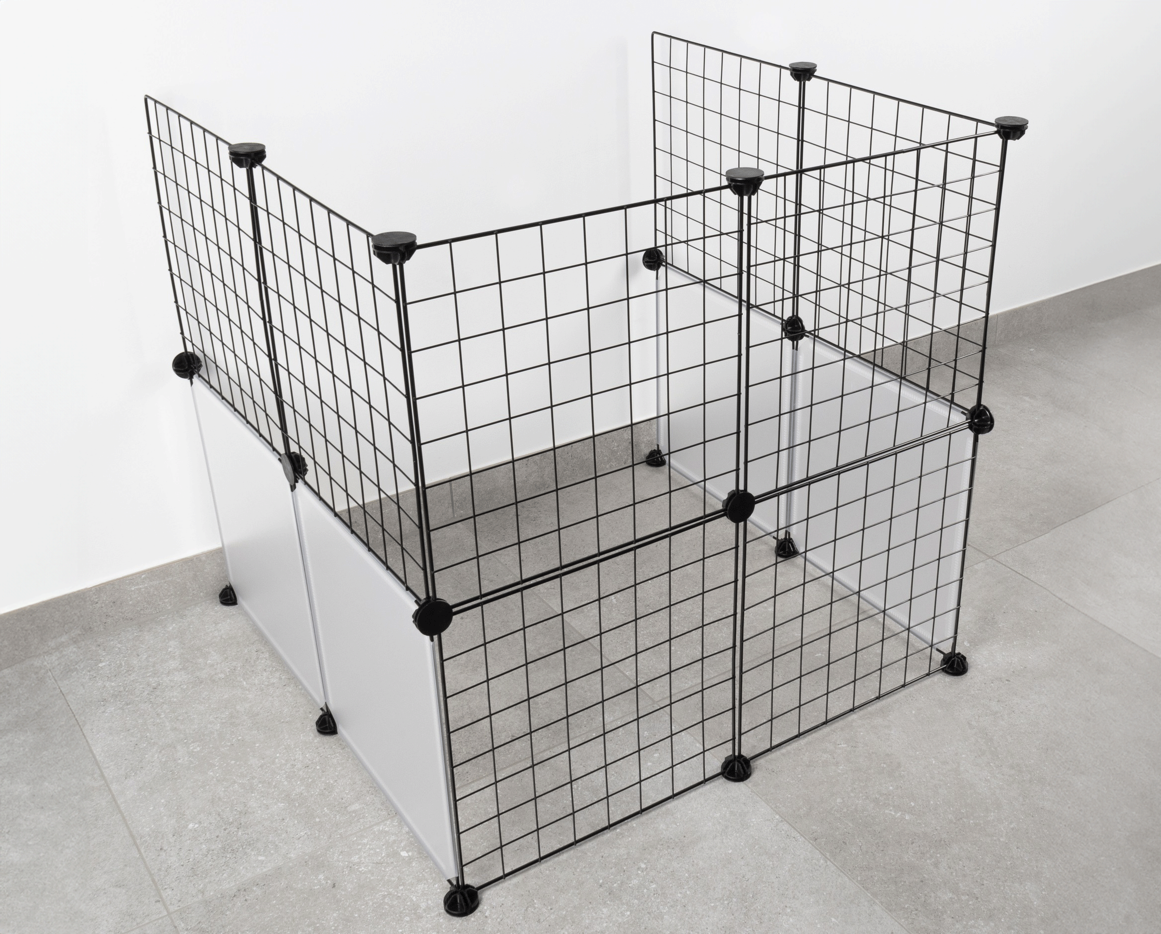 Sháníte pro svého drobečka univerzální ohrádku, kterou lze snadno použít v bytě, na zahradě i na cestách? Pořiďte mu modulární výběh Peter – dvanáct drátěných panelů (35 × 35 cm, dráty Ø 2/4 mm, oka 41 × 41 mm) s elektrostatickým nástřikem a čtyřiadvacet spojek z technického plastu, ze kterých sestavíte jak otevřený výběh (nižší obdélníkový nebo vyšší čtvercový), tak krytou klícku. A kdyby vám základní sada nestačila, můžete ji snadno rozšířit přídavnými panely nebo nahradit drátěné panely deskami z průsvitného plastu.