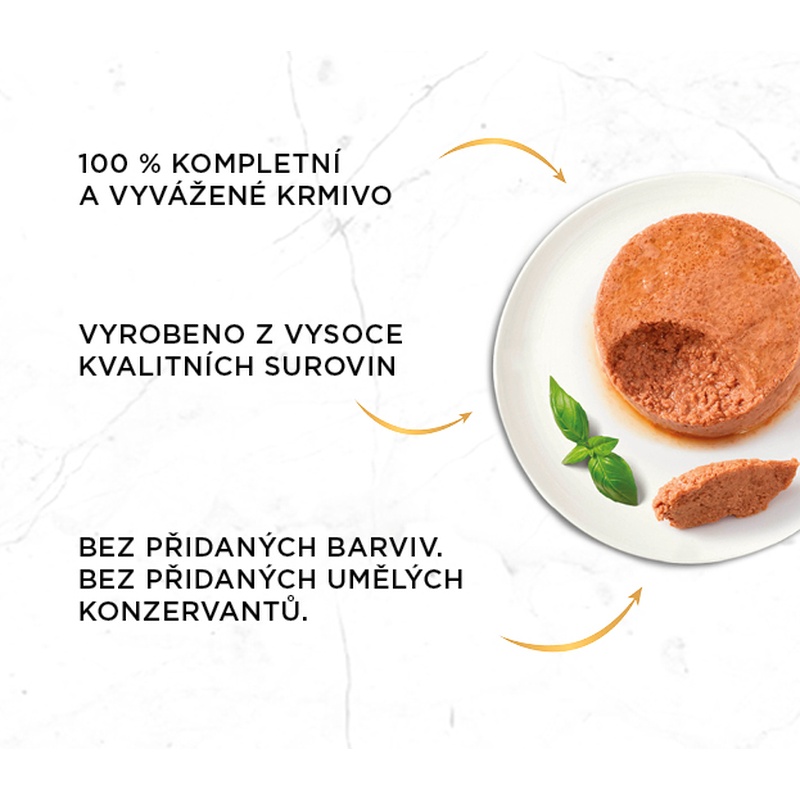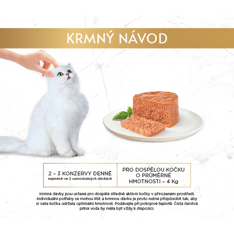 Dospělou kočku o průměrné hmotnosti 4 kg krmte 2–3 konzervami denně nejméně ve 2 samostatných dávkách. Krmné dávky jsou určené pro dospělé středně aktivní kočky v přirozeném prostředí. Individuální potřeby koček se mohou lišit, krmnou dávku je proto nutné přizpůsobit tak, aby si kočka udržela optimální hmotnost. Podávejte při pokojové teplotě. Kočka by měla mít vždy k dispozici čerstvou pitnou vodu.