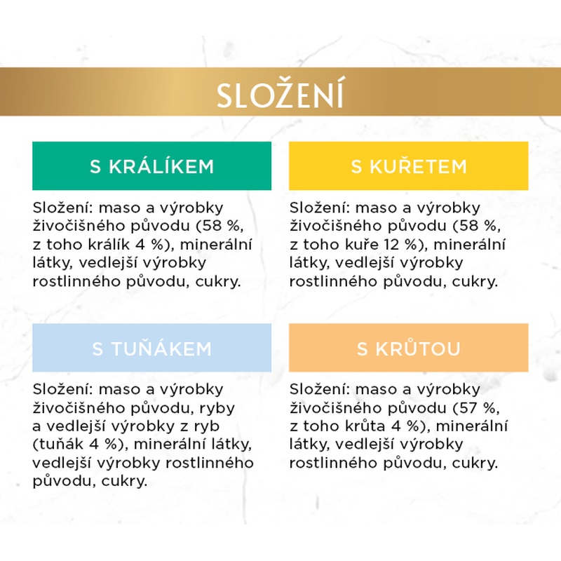 Balení obsahuje: 12× konzervu s králíkem, 12× konzervu s tuňákem, 12× konzervu s kuřetem a 12× konzervu s krůtou.