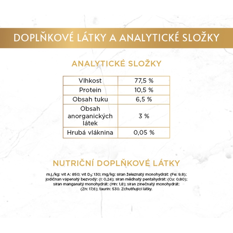 vitamín A 850 MJ, vitamín D3 130 MJ, síran železnatý monohydrát (Fe: 9,8 mg), jodičnan vápenatý bezvodý (I: 0,24 mg), síran měďnatý pentahydrát (Cu: 0,8 mg), síran manganatý monohydrát (Mn: 1,8 mg), síran zinečnatý monohydrát (Zn: 17,6 mg), taurin 530 mg. Zchutňující látky.