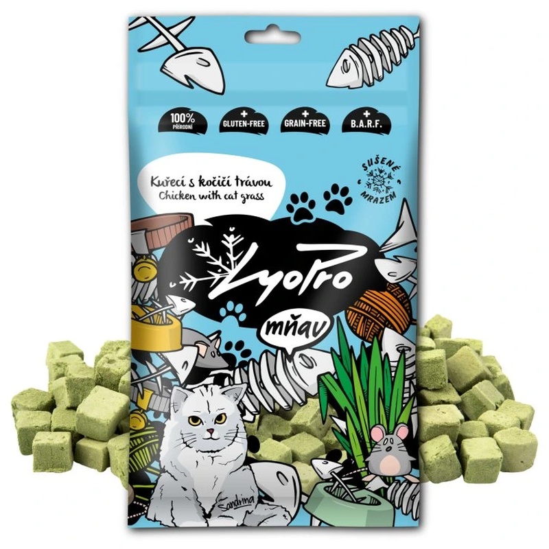 LyoPro mňau Kuřecí kostky s kočičí trávou = jednoduše zdravá, lehká a výživná odměna.
