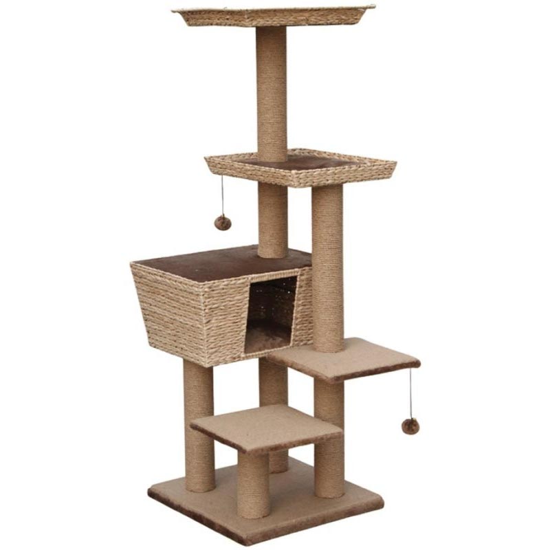 Přírodní škrábací strom z vodního hyacintu. Z různých možností k úkrytu a odpočinku si kočka může vybrat, kde se jí právě nejvíce líbí. Domeček z vodního hyacintu slouží jako úkryt a k nerušenému spánku. Velká polstrovaná výhledová podesta s okrajem z vodního hyacintu nabízí další místo ke spaní a naleznou zde dostatek místa i velké plemena. Odolnost tohoto domečku je dána především použitým přírodním materiálem, ale i kvalitním ručním zpracováním.