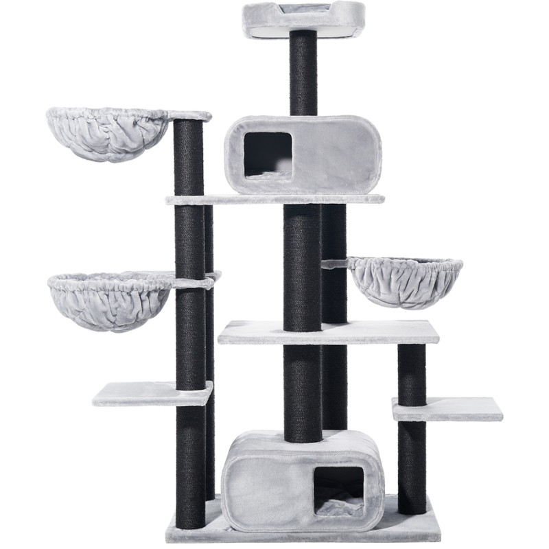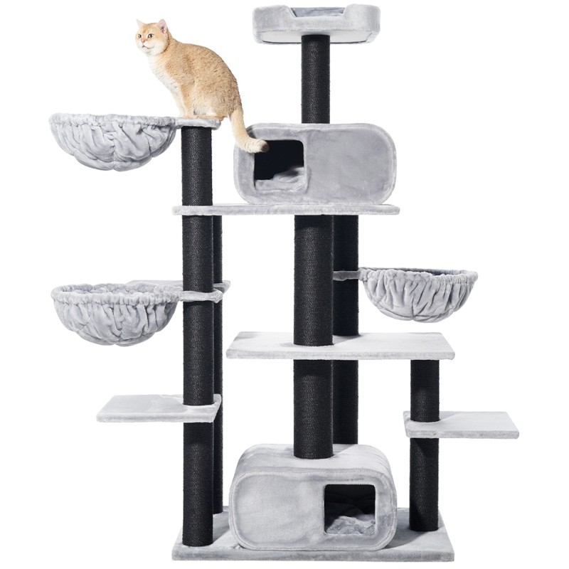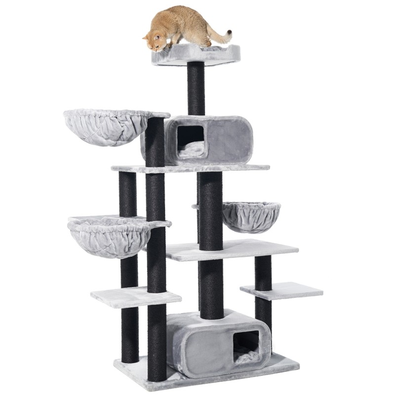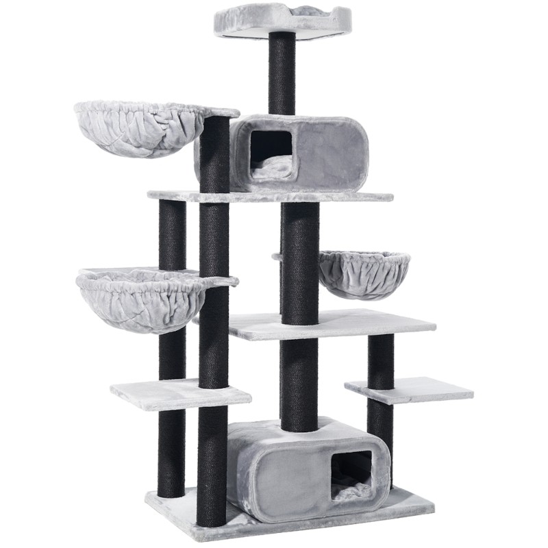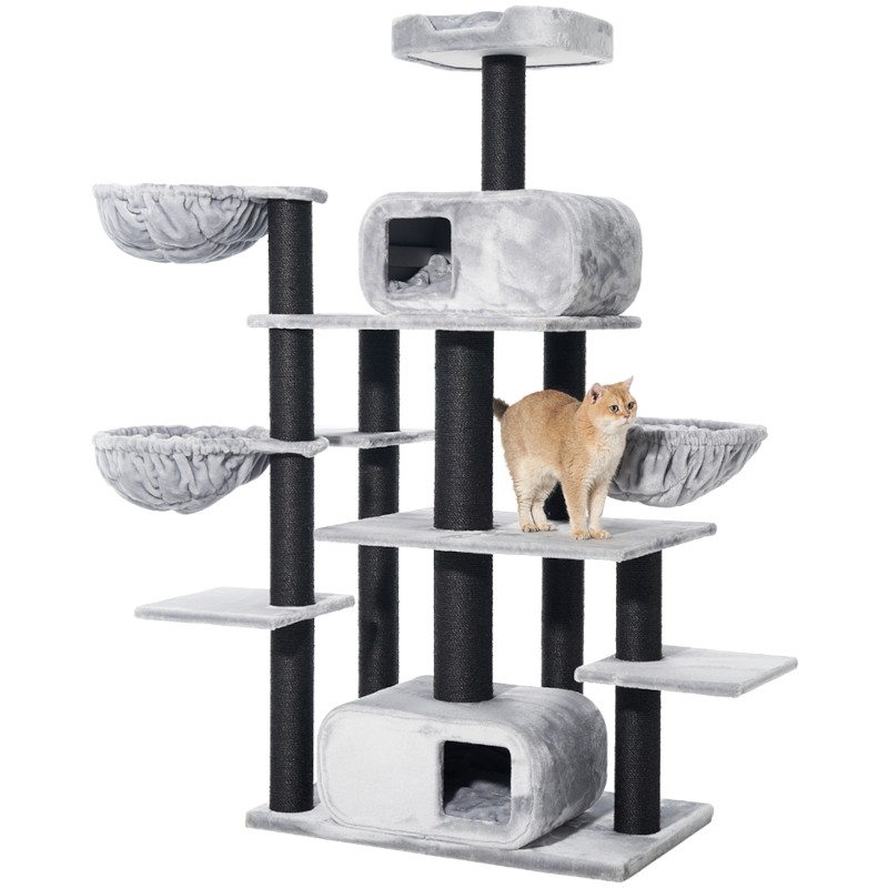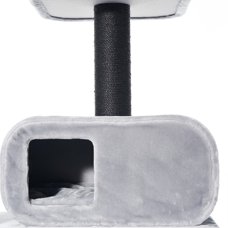 Stylové škrabadlo Nobby Todor nabídne kočkám dostatek prostoru pro škrábání, zábavu i odpočinek. Rozložitý kočičí strom je potažený měkkým plyšem a jeho robustní kmeny o průměru 11 a 15 cm jsou ovinuté sisalovým provazem. Má mnoho odpočívadel, dva domečky s pohodlnými polštářky, tři kruhové průvěsy a vyhlídku. Je díky tomu vhodný i do domácností s více kočkami.