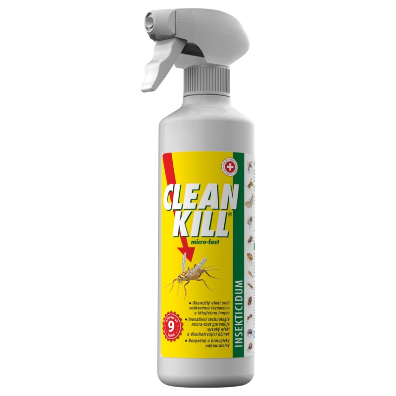 Nepostradatelný pomocník v boji proti hmyzu. Přednostní tohoto nového insekticidu je jeho inovativní patentovaná dvousložková receptura, která zabezpečuje okamžitý knock-down efekt na široké portfolio hmyzu při postupném uvolňování po dobu až 9 týdnů. Clean Kill působí kontaktně s okamžitým a dlouhotrvajícím účinkem proti veškerému lezoucímu a létajícímu hmyzu včetně much domácích, komárů, švábů, mravenců domácích, rybenek, štěnic, klíšťat, blech, molů, roztočů, termitů, vos, domácích pavouků a vší.