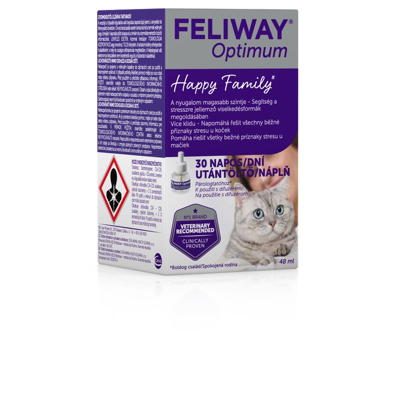 Feliway Optimum obsahuje nejpokročilejší komplex kočičích feromonů, který je zdrojem zklidňujících signálů, díky nimž se kočky cítí v domácím prostředí dobře. Tyto signály kočkám dodávají pocit jistoty a bezpečí a podporují harmonické vztahy mezi více kočkami v domácnosti. Kočičí feromony dokážou vnímat pouze kočky – neúčinkují na psy ani na lidi.