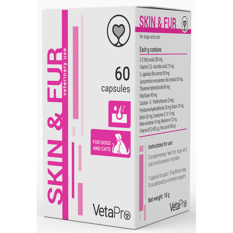 Skin & Fur je nutriční doplněk pro psy a kočky s kožními poruchami (suchá, zarudlá, svědící, šupinatá kůže – lupy, vypadávání chlupů, špatná srst). Pro zlepšení zdraví kůže a srsti.