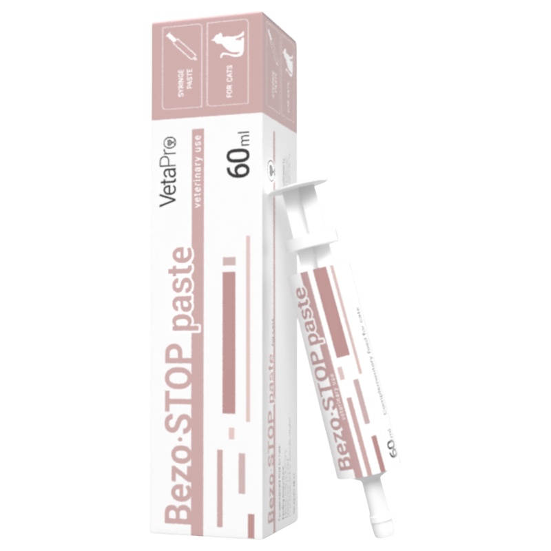 Bezo-Stop Paste je doplňkové krmivo ve stříkačce na bázi oleje určené k odstranění a prevenci tvorby trichobezoárů u koček. Pokrývá žaludek a trávicí (gastrointestinální) trakt olejovou vrstvou v místech, kde cizí tělesa mohou způsobit obstrukci. Preventivní použití se doporučuje u plemen koček s dlouhou srstí (perské) a u koček chovaných v interiéru bez přístupu k hrubým vláknům (trávě), které by vyvolávaly zvracení.