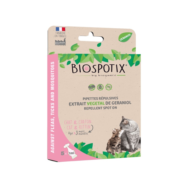 Biospotix spot-on s repelentním účinkem je řešení, které účinně ochrání vašeho kočičího mazlíčka před vnějšími parazity – blechami, klíšťaty a komáry. Aktivní složky na bázi geraniolu dehydratují a blokují dýchací systém hmyzu. Paraziti jsou tím zahubeni a kočka účinně ochráněna před napadením.