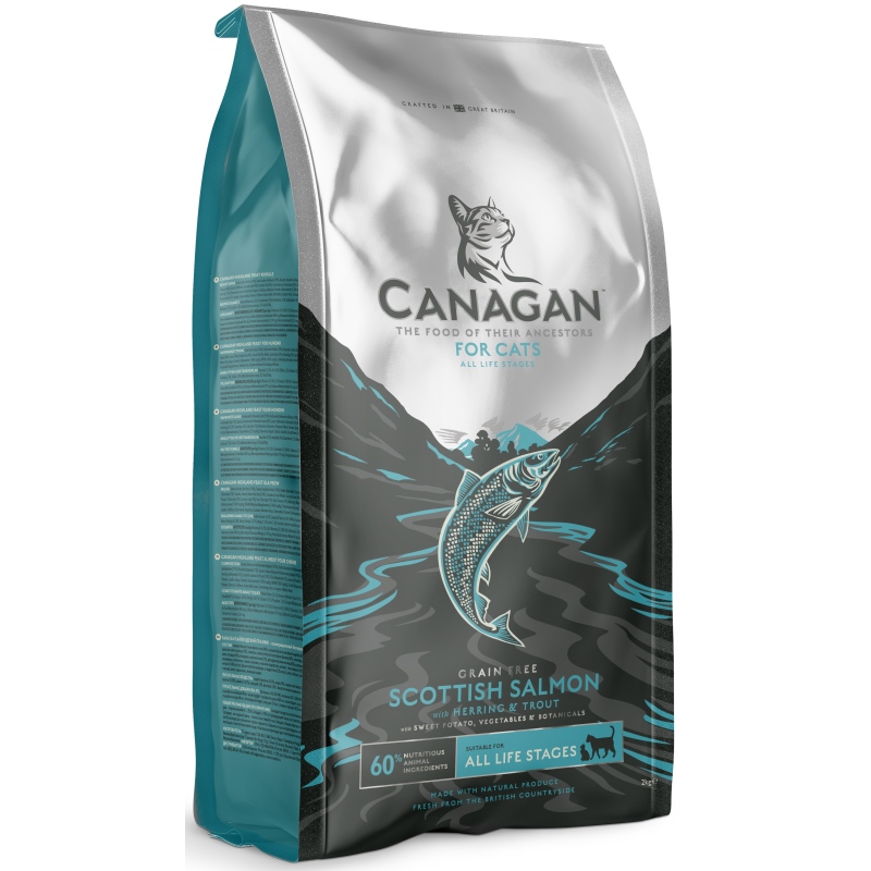 Kompletní krmivo pro kočky Canagan Scottish Salmon je pečlivě připravená bezobilná receptura, která kombinuje maso několika druhů ryb. Čerstvě připravený vykostěný losos je doplněn o sledě, pstruhy a bělomasé mořské ryby a všechny jsou zpracovávány podle standardů platných pro lidské potraviny. Živočišné suroviny jsou perfektně doplněny mnoha druhy zeleniny a bylin. Canagan Scottish Salmon se sníženým obsahem sacharidů představuje jedinečnou recepturu s biologicky snadno dostupnými bílkovinami.