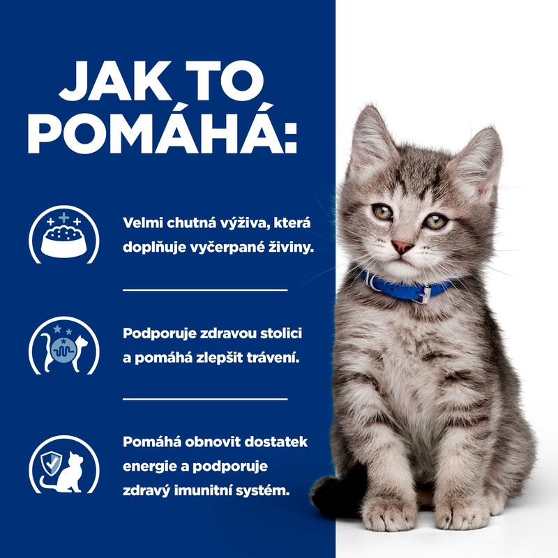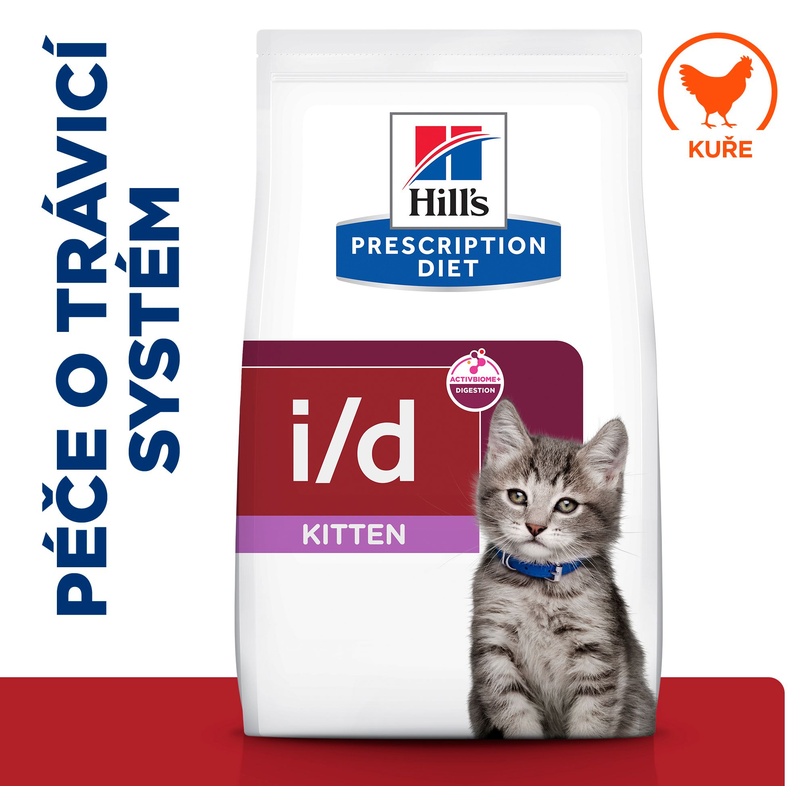 Hill's Prescription Diet Digestive Care i/d Kitten je kompletní dietetické krmivo s kuřetem určené k omezení střevních resorpčních onemocnění a ke kompenzaci špatného trávení a exokrinní pankreatické nedostatečnosti koťat. Granule mají zvýšený obsah sodíku a draslíku a obsahují vysoce stravitelné ingredience. ActivBiome+ Digestion je patentovaná směs prebiotické vlákniny, u které bylo klinicky ověřeno, že rychle vyživuje střevní mikrobiom, čímž podporuje zdravé trávení a celkovou pohodu kotěte.